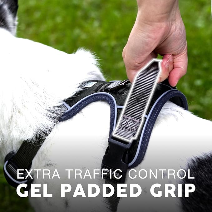 - BUILT TO KEEP YOUR DOG SAFE - Made from heavy duty Oxford and Military Grade Nylon materials, the harness features reflective strips, a Gel handle for largel dogs no pull has a pulling strength of up to 750 LBS! Enjoy the Front & Back leash attachments and soft padding to protect your dog's trachea.