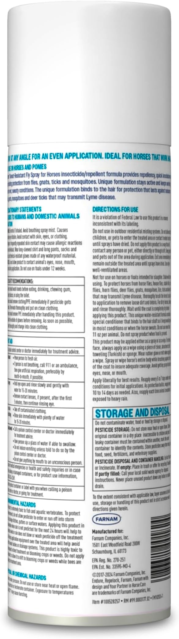 - DEFEND YOUR HORSE’S HEALTH with Endure Sweat-Resistant Fly Spray for Horses; this spray helps prevent exposure to deer ticks that may transmit Lyme disease