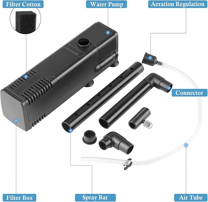- [Multifunctional Fish Filter] The fish tank filter has two different outlets, a spray bar and an aeration outlet. The spray pipe can allow water to flow out like a waterfall, which has a good filtering effect and allows a small amount of oxygen to enter the fish tank. The oxygenation outlet can effectively oxygenate and adjust the amount of oxygenation.