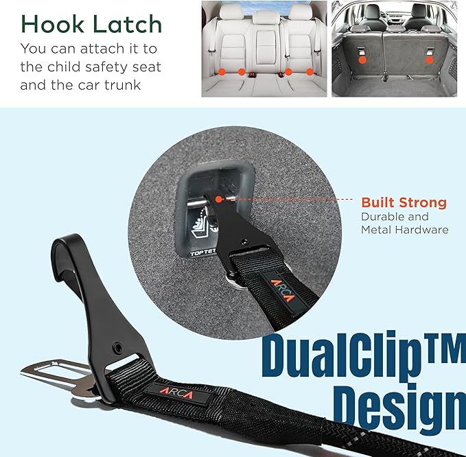 - DUAL BUCKLE SECURITY: a seatbelt buckle for easy attachment to car seats and a sturdy metal hook latch for versatile use in the front seat, back seat, or trunk, ensuring optimal safety for your pet.