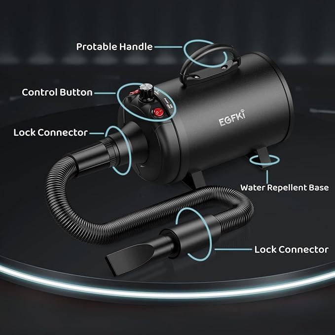 - Strong Blow Force: The power of this dog hair dryer is 5.2 HP/3800 watts. The strong blow force enables the dog hair dryer to dry the thick dog hair, remove loose dog hair, dirt,and scurf, making the dog hair more smooth and shiny to achieve the beauty effect of pet grooming shop.