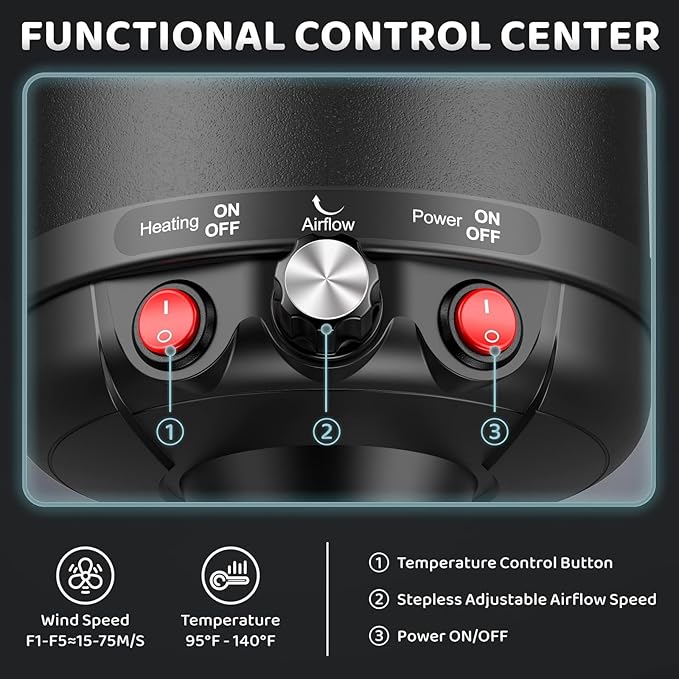 - Adjustable Speed & Temperature: Strong and stable motor equips this dog blow dryer with several speed and temperature levels. Maximum Wind Speed: 72m/s; Temperature Range: 95℉-135℉. The dryer will stop working immediately if the temperature is too high because it has a built-in temperature control protection system.