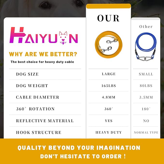 - STURDY DOG TIE OUT CABLE:The HaiYUAN multi-functional, multi-size, ultra-tensile pull cable provides greater range of motion for dogs. Designed for large, medium and small dogs up to 165 lbs.