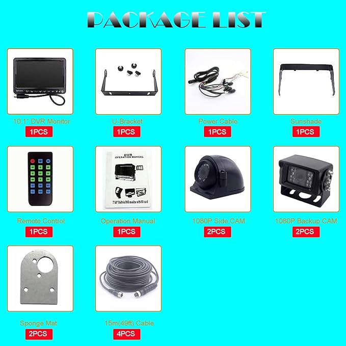 - 【Package List】10 inch Monitor with DVR x 1pcs; 1080P Side Camera x 2pcs; 1080P Side Camera x 2pcs; 4PIN 15m Cable x 4pcs ; Please kindly note: SD Card Is Not Included.