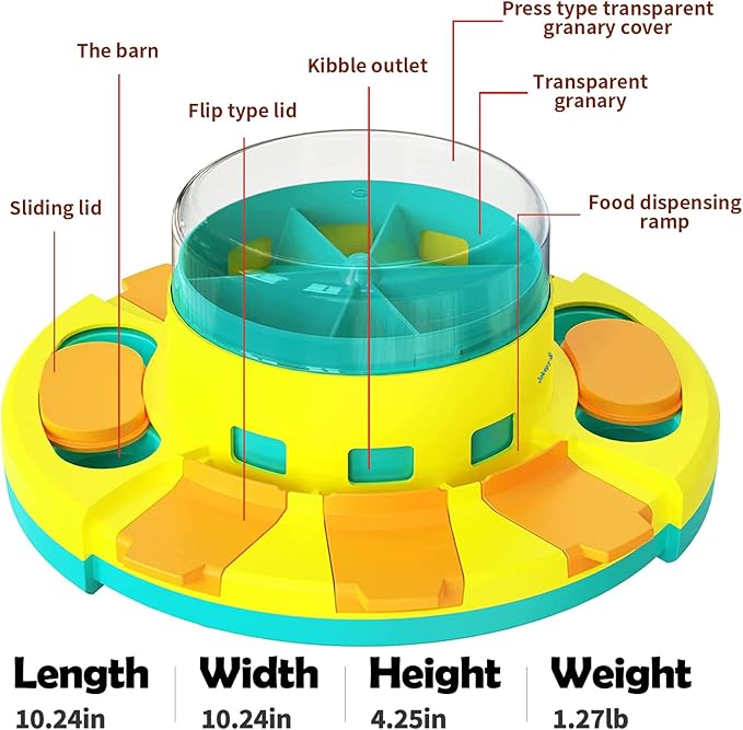 - 🐾【Easy to Use】Dog puzzle toys have 6 flip type lids, you can add food to the granary, pets press down on the transparent lid, food will fall into the leaky food-box. Pets also can eat food by moving 2 sliding lids.