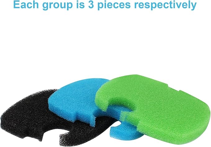 - Note: 9 bio sponge filter pads: 3 coarse (black), 3 medium (green), 3 fine (blue), remove and clean with water when you notice the sponge pads are getting dirty to ensure water quality.