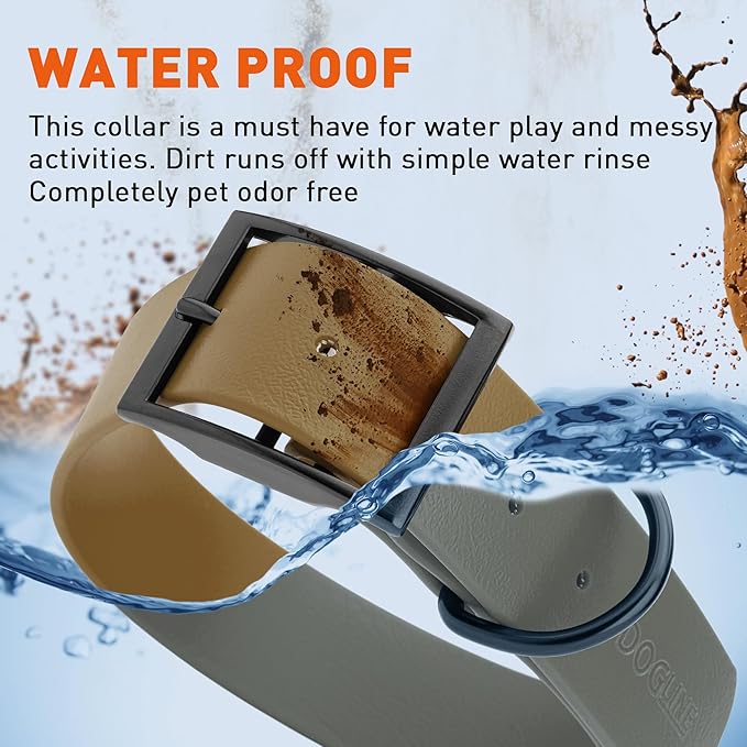 • Free Your Dog to romp in puddles and retrieve from lakes with the Dogline Biothane Waterproof Dog Collar. This water-repellent collar stays dry and odor-free, without shrinking or losing flexibility.