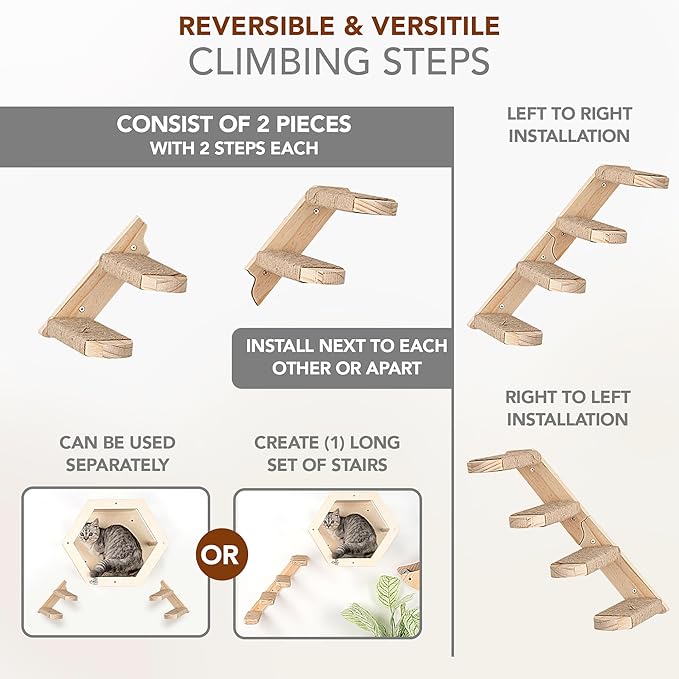 - 🐾MODERN DESIGN: Elevate your home decor with our space-saving cat shelf. The cat steps offer flexibility with a reversible design (install left-to-right or right-to-left) and are wrapped with durable jute ropes, making them highly resistant to cat scratching.
