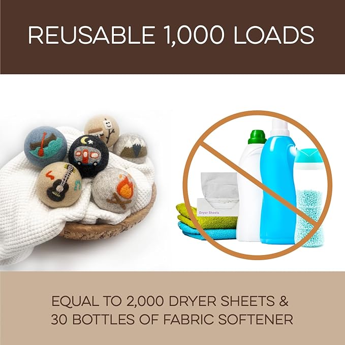 - ADORABLE DESIGNS - A THOUGHTFUL GIFT FOR ANY OCCASION: Bring adventure to your laundry day with this playful set of wool dryer balls. It includes a Guitar, Camper, Mountains, Camp Fire, S’mores, and a Boat/Canoe, all neatly packaged in a reusable linen drawstring storage bag, they’re ideal for gifting at baby showers, housewarmings, or as a fun surprise for someone special. These cute and practical dryer balls are sure to delight everyone!
