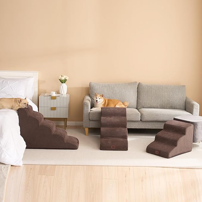 - MULTIPLE STEP SIZES - This dog stair has 2 steps, 3 steps, 4 steps and 5 steps to choose. Our 2-step stairs fits for chair/sofa/bed up to 13inch. 3-step stairs fits for chair/sofa/bed up to 17inch. 4-step stairs fits for chair/sofa/bed up to 21inch. And 5-step stairs fits for chair/sofa/bed up to 24inch.