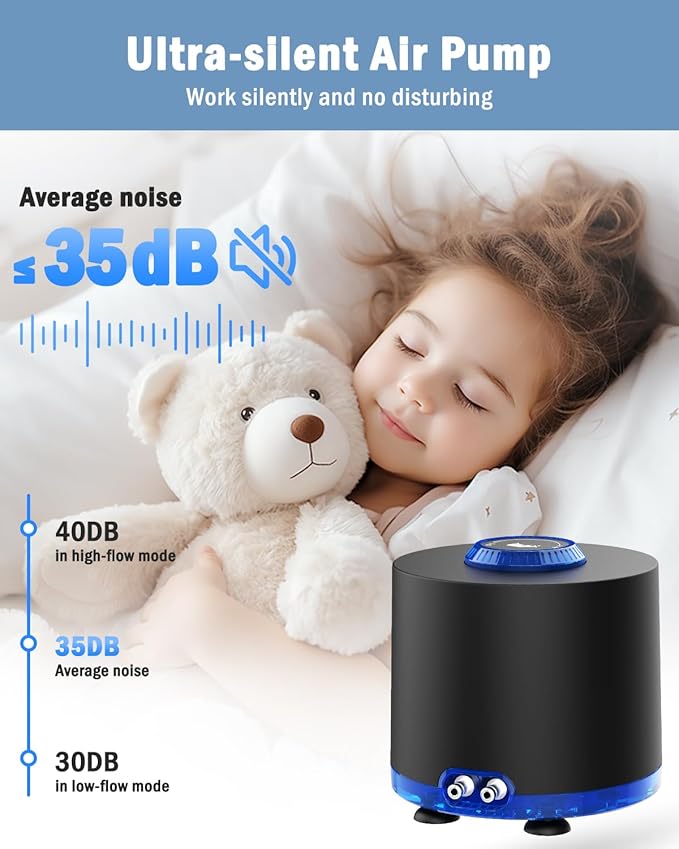 - NOISE REDUCTION ULTRA QUIET FUNCTION - The aquarium air pump features a sturdy double-layer structure with a built-in air pump and thickened casing, the bottom of the pump is designed with four soft rubber pads, which not only reduce noise, the max noise does not exceed 35dB but also prevent the pump from moving excessively during operation.