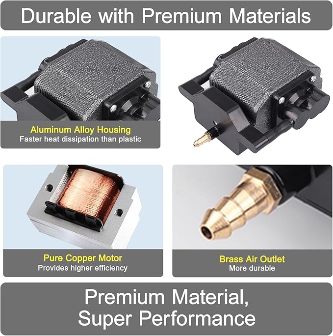 - DURABLE ALUMINUM ALLOY HOUSING - The commercial air pump is built with an aluminum alloy housing, known for its excellent heat dissipation properties. This ensures low operating temperatures and a longer lifespan for the pump.
