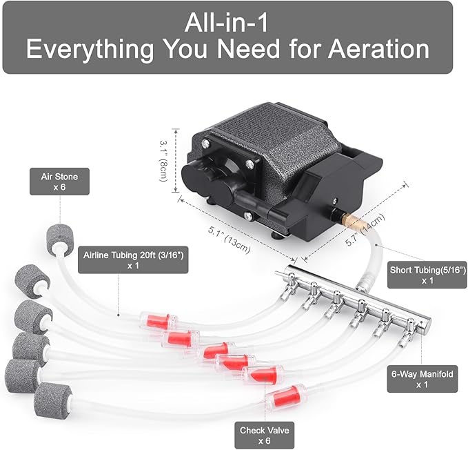- ALL-IN-ONE PACKAGE - This aerator pump includes everything you need for effective water aeration, including a 6-outlet metal manifold, check valves, airline tubing, and air stones.
