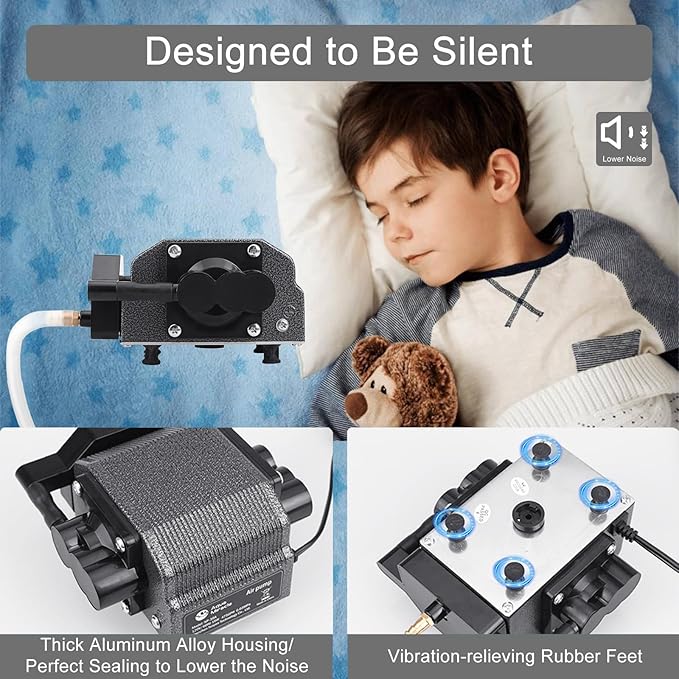 - QUIET OPERATION - Designed to be compact and silent, this fish tank air pump boasts a super thick metal housing, advanced rubber diaphragm, and rubber vibration-relieve feet. The perfect sealing and multiple denoising structural considerations ensure a noise-free experience.