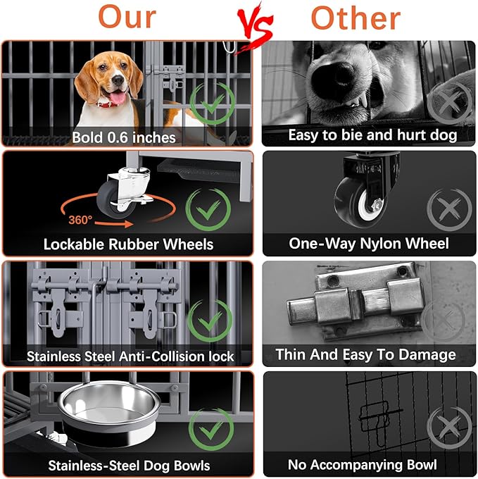 - 【Practical & Easy to Move and Clean】The dog crate comes with four smooth rolling locking wheels for easy movement and fixation, you can easily move the crate to different positions as needed. The dog crate comes with a pull-out tray for easy removal and cleaning. It also comes with a safety latch to avoid your smart dog from opening the iron door, effectively protect your pet.