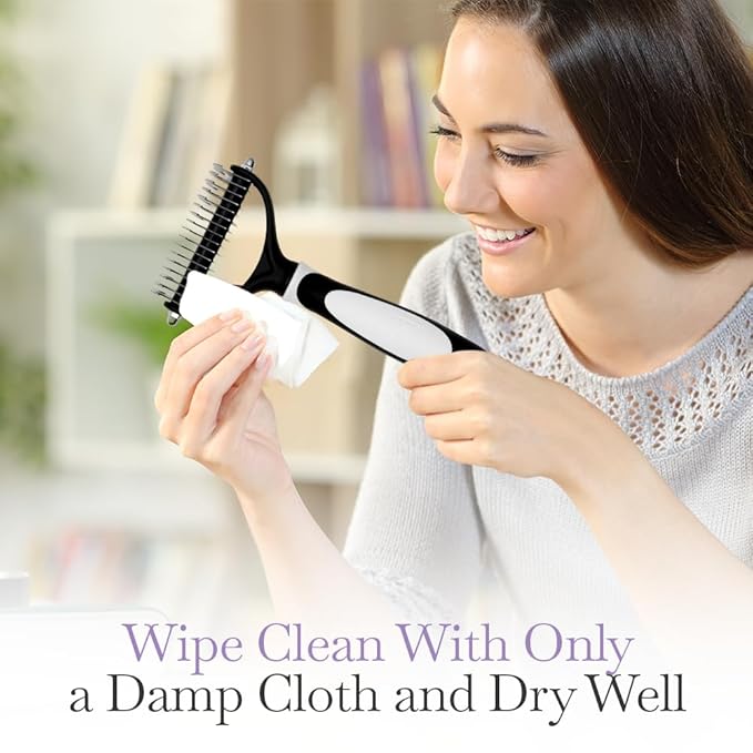 - Boasts 2 Sides: Designed for mat and tangle removal, this Dual-Head Dematting Pet Comb features a wider gap side of 9 teeth to loosen larger, stubborn mat patches, while the narrow gap side of 17 teeth cleans up the smaller tangles for a nice finish.