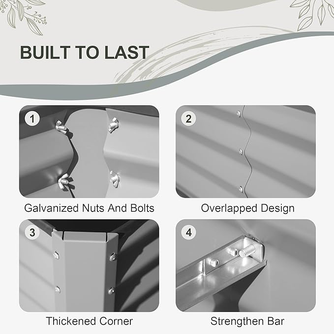 - Thicker Material: Made of thick galvanized steel plate with eco-friendly coating, rust-proof and durable. The 0.8mm thickness, reaching 1.8mm in the thickest part, ensures long-lasting raised garden beds' outdoor aesthetics.