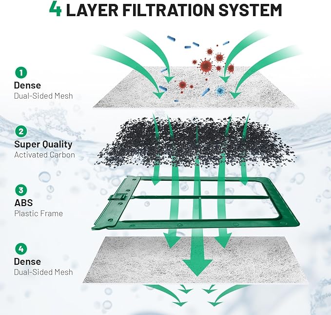 - 【Durable design, durable stability】 : Built-in ABS frame, uniform distribution of activated carbon and filter media, to ensure that every drop of water is fully filtered. ABS plastic edges are more durable and resistant to deformation, making them a perfect fit for Whisper filters