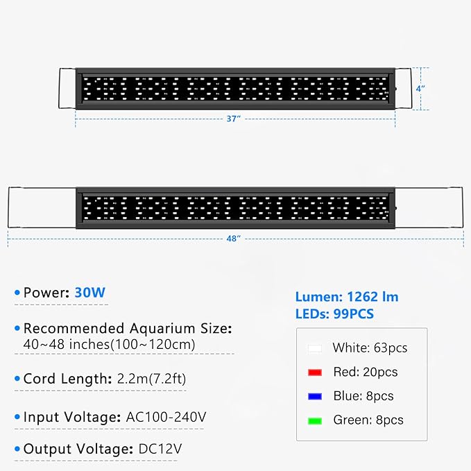AQQA Aquarium Light,Full Spectrum Fish Tank Light for Plants,3 Mode+Timer+Adjustable Brightness,High Brightness LED Beads with Extendable Brackets for Freshwater (30W for 40-48inch)