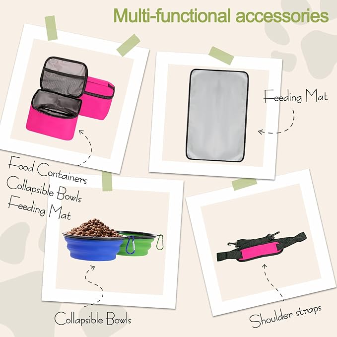 - 【Travel Bag For Dog Kit Include】: 1 Dog Tote bag, 2 Dog Food carriers bag, 1 Water-Resistant Placemat, 2 Pet Silicone collapsible bowls (The colors of the bowl are randomly matched). This dog travel tote bag is the ultimate food storage and supply gear for any trip.