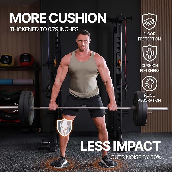 - [Upgraded Dual-Layer Design]: Concerned about your equipment scratching the floor during workouts? Our 2in1 Rubber Top EVA Foam Exercise Gym Mats are crafted to solve this issue. The textured rubber top layer, combined with a high-density EVA foam bottom layer, seamlessly creates a non-slip tough surface with excellent shock absorption.