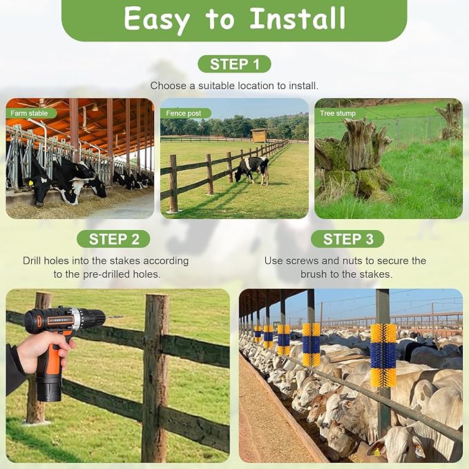 - 🐴Easy to install/disassemble, This goat brushes for grooming includes 2 brush and 8 screws. It can be installed in barns, pastures, livestock fences, horse sheds, trees, walls, or anywhere outdoors, and it is also easy to dismantle if you need to demolish it.