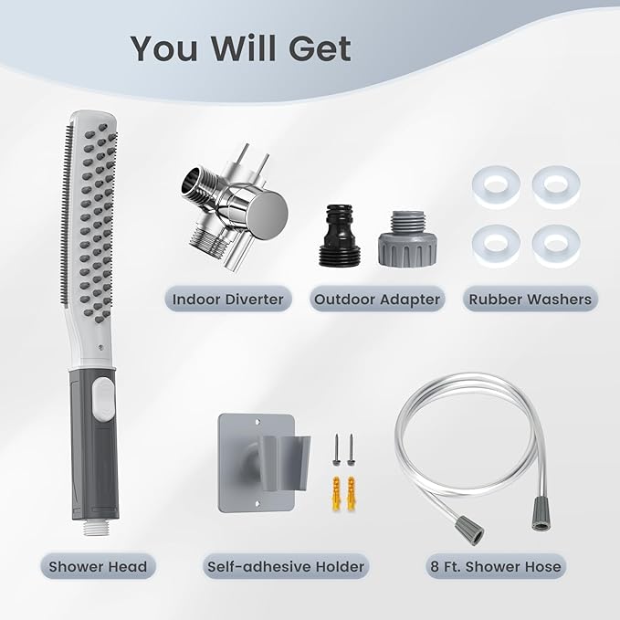 - 【Complete Dog Shower Attachment】 The Petlipo Dog Showerhead Attachment includes the pet showerhead, 8-foot flexible hose, outdoor hose adapter, a self-adhesive holder, and indoor T-diverter. This all-in-one pet bathing station ensures a high-quality cleaning experience for your furry friends at home. Enjoy peace of mind with our 24/7 customer support for any questions or concerns.