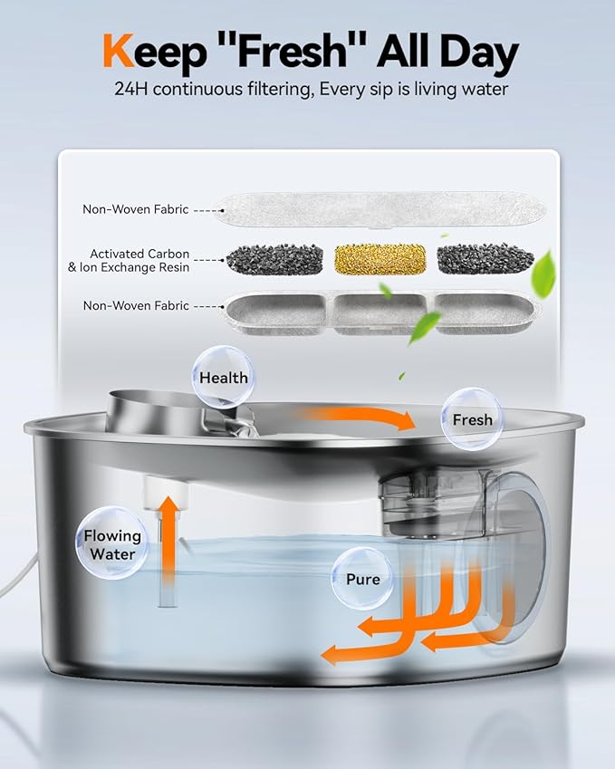 - 【 Refreshing Every Sip 】MAILOFY choice superior materials for filtration system, 4-layer filtration (pre-sponge, sponge, ion-exchange resins & activated carbon, sponge) to guarantees water cleanliness. Tips: For your pet's health and to ensure the fountain works properly, we recommend replacing the filter and sponge every 2 weeks.