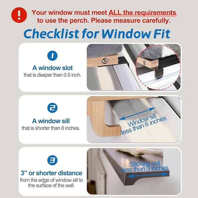 - **Important: Check for WINDOW REQUIREMENT** Please make sure the window you will apply to has a 0.5-inch or deeper slot (hook thickness: 0.08 inch), a 9-inch or shorter window sill and a 3-inch or shorter gap between the edge of window sill and the surface of the wall under the window. **Your window MUST meet all the requirements to use the perch**