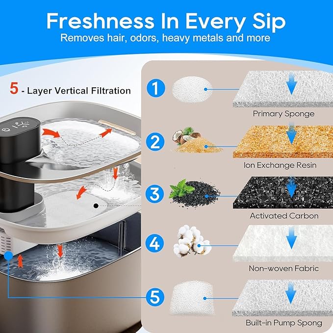- 5 - Layer Vertical Filtration:1.Primary sponge filtering hair and detritus. 2.Ion resin removes heavy metal ions and softens water quality. 3.Activated carbon eliminates offensive odors. 4.The non-woven fabric captures impurities and cat hair. 5.The built-in pump sponge further filters debris to prevent blockages and damage