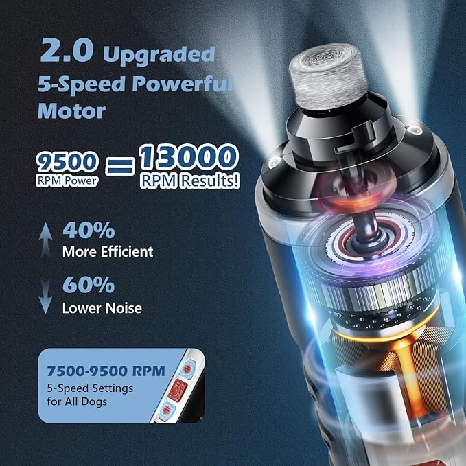 - 【5-Speed Switch & 3 Grinding Ports】This dog nail trimmer features an advanced 5-speed adjustable motor and 3 grinding ports, with an additional replacement grinding head included. Our 2.0 upgraded motor increases efficiency by 40% and reduces noise by 60% compared to traditional motors. Which allows pet owners to adjust the speed and grinding settings based on their pet's size and nail hardness, ensuring a more precise and comfortable trimming experience.
