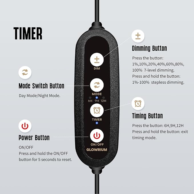 - 【2025 New Upgrade】Waterproof IP65 ,In timer mode, you can freely switch between daylight and moonlight mode. Note that when switching from daylight to moonlight (blue light), then it will continue to run for 24 hours. But you can adjust the brightness of the spectrum with fade up and down function kept.