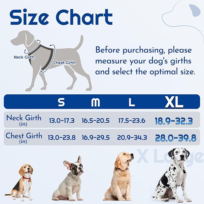 - Precision Fit: Equipped with 4 adjustable straps, the harness can offer a customizable fit, embracing diverse breeds and sizes while leaving ample room for your pup to grow. Size-XL is suitable for neck girths of 18.9"-32.3" and chest girths of 28.0"-39.8"
