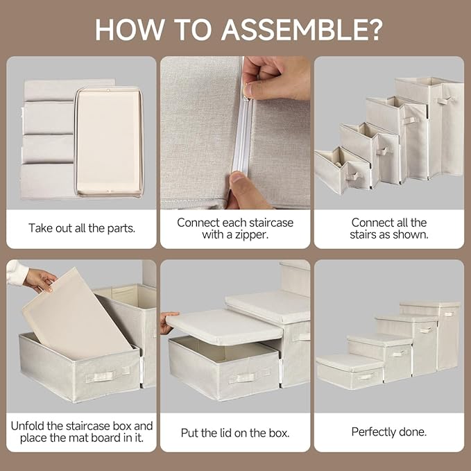 - Easy to Assemble: First, you need to attach the zipper of each step, then open each step completely, put each support board into the corresponding storage box, and finally close the lid. When not needed, remove the lid and fold it completely so you can easily move, transfer and store it. This saves space and is suitable for small rooms