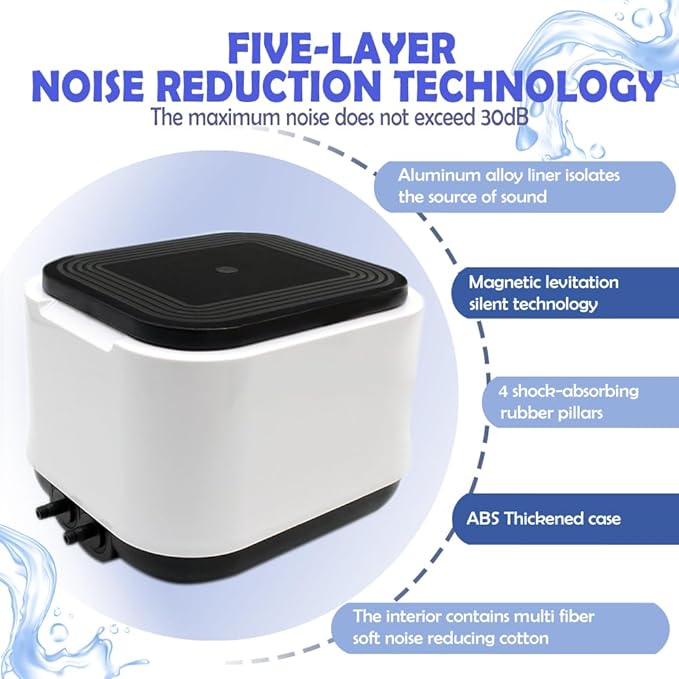- [Double Air Outlets, Powerful Performance]: 5w power can achieve a displacement of 190GPH, low power consumption makes it more energy-efficient, and the output airflow is naturally uniform and stable. It allows you to inflate multiple water tanks at the same time, with a pressure of 0.02Mpa, and can reach a water depth of 5 feet. It is suitable for quiet indoor environments and can be used with equipment such as sponge filters and nano bubble stones