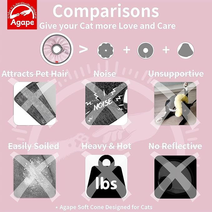 - 【Soft & Lightweight】Unlike bulky, uncomfortable cones on the market, Agape's cat cone is made with two layers of silky fabric and a ribbed knit collar, weighing just 1.7 ounces—about the same as two single AA battery. This ultra-light, breathable, and soft design ensures your cat can sleep peacefully and comfortably, without feeling any strain or restriction around their neck