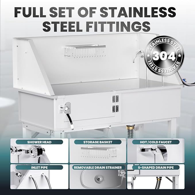 - The DYTREND dog washing station features a stainless steel surface coated with a white powder finish, offering enhanced protection against scratches and ensuring the inner steel stays intact. This finish not only improves durability but also provides a sleek, modern look that seamlessly complements various furniture styles
