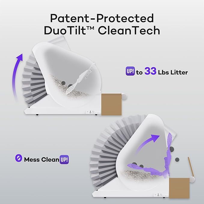 - 𝘾𝙡𝙚𝙖𝙣 𝘾𝙝𝙖𝙢𝙥𝙞𝙤𝙣: Two-stage tilting method combines passive & proactive operations (i.e. gravity sift and catapult dump) for thorough cleaning; leaves fewer scraps behind, dislodges sticky clumps, reduces dust created from abrasion, and minimizes stains trailed by runny poops