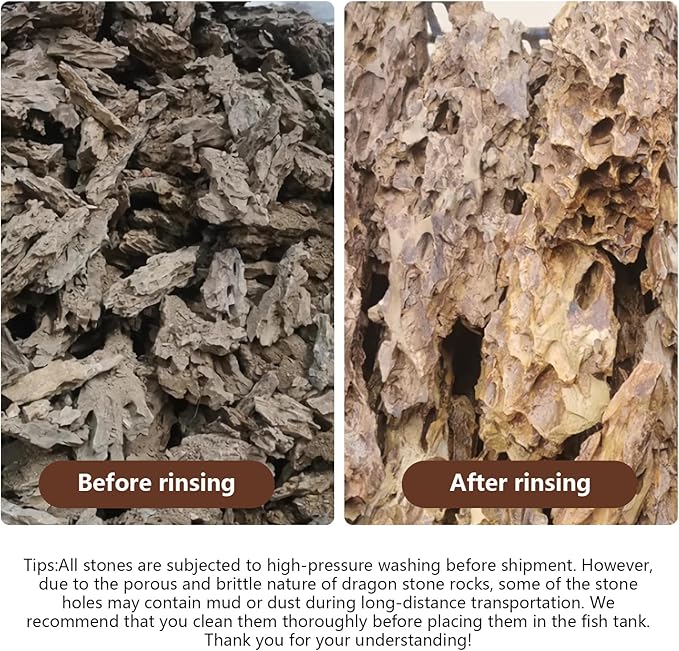 - Aquarium safe: Our natural aquarium rocks maintain pH balance without altering water chemistry. These aquarium decor rocks provide the perfect habitat for aquatic life while enhancing visual appeal.Tips:All stones are subjected to high-pressure washing before shipment. However, due to the porous and brittle nature of dragon stone rocks, some of the stone holes may contain mud or dust during long-distance transportation. We recommend that you clean them thoroughly before placing them in the fish tank.