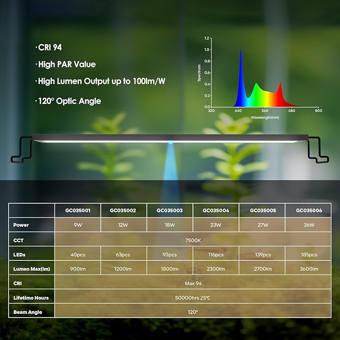 - 【High Luminous Efficiency and CRI】 Featuring energy-efficient LED technology, the light significantly enhances lumen output and CRI, ensuring optimal growth for aquatic plants while creating a more natural environment for your fish. The specially designed blue spotlight is perfect for planted and native aquariums, adding a dreamy and immersive atmosphere.