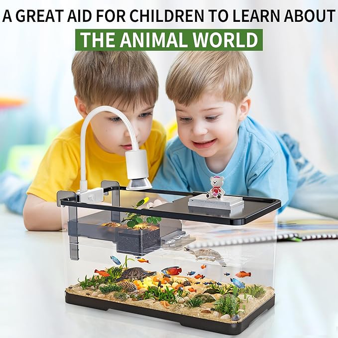 - 【Complete Small Reptile Starter Kit】Includes: 1* tank +1* lid, 1* light +1* UVA/UVB light bulb, 1*Adjustable climbing platform, 3* decorative plants +1* stone pack +1* filter balls pack; Including everything you need.