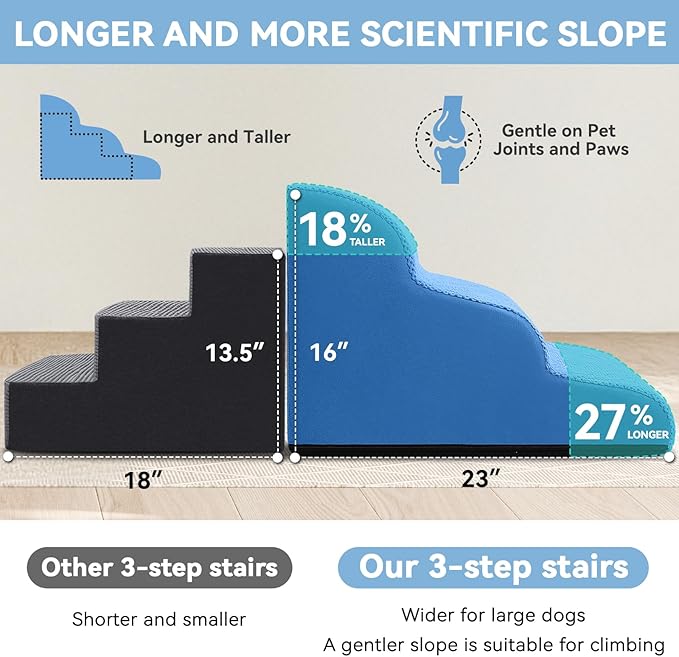- Specific & Durable Design: Low angle slope design reduces the pressure on joints when pets jump up and down from high bed, sofa, chair and car. Portable handle makes moving stairs easily at home or taking a trip with your pet. The non-slip bottom keeps the stair firmly planted on the ground. No more worrying about your pet slipping and getting hurt! Our foam stair is an essential part of your beloved pet's life! It combines functionality, safety, and durability in one stylish package!