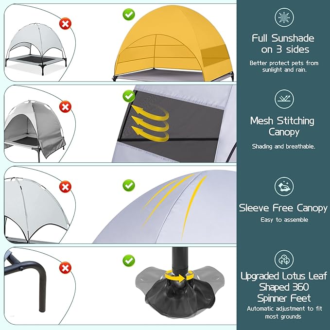 - 【More Than A Dog Canopy Bed】 This dog cot bed is more than just a pet camping essential! The shade canopy can be removed for indoor use, airflow underneath to keep the pet cool. Our dog cot bed boasts upgraded adjustable feet that make the raised dog patio bed perfect for outside activities like camping, hiking, beach, and backyard picnics.