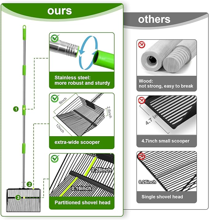 - 【Ergonomic Design】: The detachable stainless steel handle on our HUMUMU jumbo metal litter scoop provides a comfortable and secure grip. The handle is designed to fit your hand perfectly, offering maximum control and maneuverability, making your chicken coop cleaning experience easy. The 66-inch length means no more bending over to clean up chicken waste, preventing back strain and discomfort.