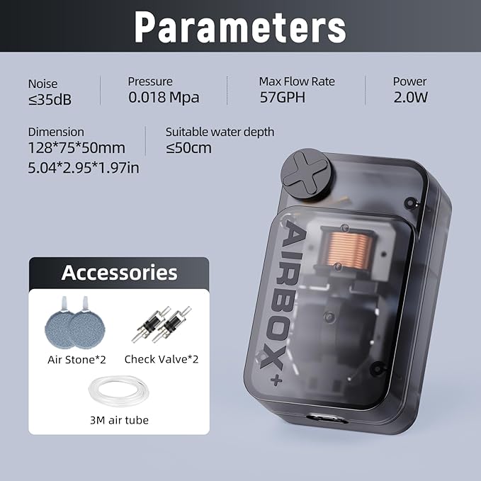 - Compact/Transparent Design: If you're looking for an aeration pump that won't clutter your space or compromise aesthetics, but still delivers excellent quiet operation and ample airflow, our fish tank air pump is the perfect solution. Its compact body saves space and is easy to place. Featuring an innovative transparent design, every detail is showcased, building consumer trust.