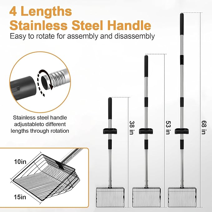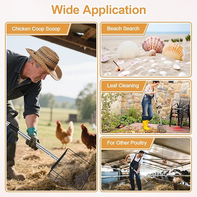 - π¨π£ππ₯ππππ ππππ¨π¦π§ππππ π¦π§πππ‘πππ¦π¦ π¦π§πππ πππ‘πππ: This chicken poop rake can be adjusted to 5 different handle lengths of 24 inches, 38 inches, 53 inches and 68 inches, the adjustable function is easy to use in a variety of scenarios and convenient for people of different heights/shapes. Metal litter rakes are great for a variety of chores, including cleaning out chicken coops, collecting dog poop, cleaning out sand pits, and scooping hay and straw