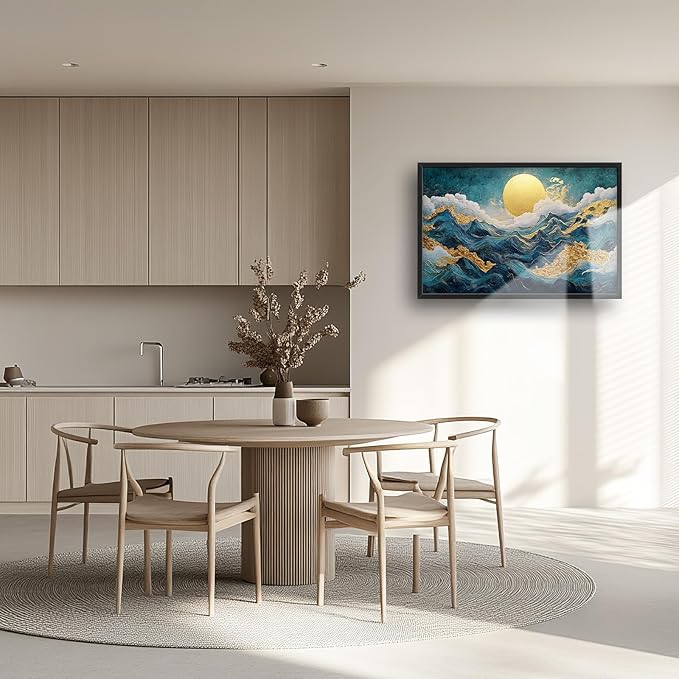 Framed Large Sun Mountain Wall Art, Oversized Teal and Golden Sun Wall Decor for Living Room, Abstract Landscape Canvas Painting Modern Artwork Home Decoration for Living Room Bedroom 36"x24"