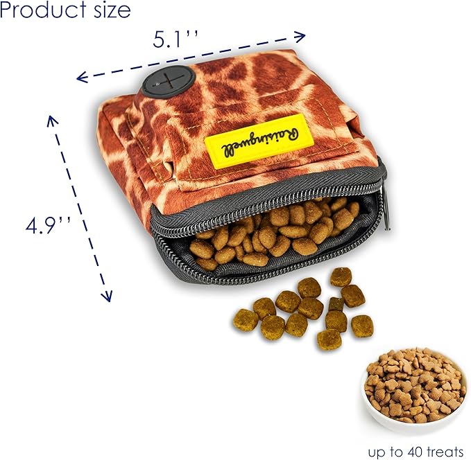 - Raisingwell Dog T1、Fashion Design: This dog training treat bag measures 4.9 x 5.1 inches and offers versatile wearing options. It comes equipped with a carabiner and a strap, allowing you to hang it on your leash, attach it to your pet's collar, or even wear it as a trendy accessory on your bag. The bag features a zipper closure, ensuring that treats stay secure inside even when you're playing with your pet afterward. It's perfect for carrying around or using during short outings.reat Pouch