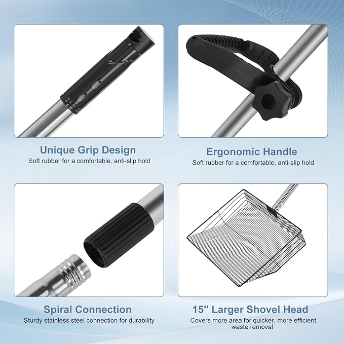 - 【Easy to Install and Clean】: This mul-tifunctional litter sifting shovel is easy to assemble, just align, clamp, and screw. The head and handle are connected by secure screws that ensure a stable and long-lasting connection. The simple swivel thread connection makes it easy to adjust and use. The non stick litter scooper design reduces feces from sticking to the scoop, simply rinse with water.