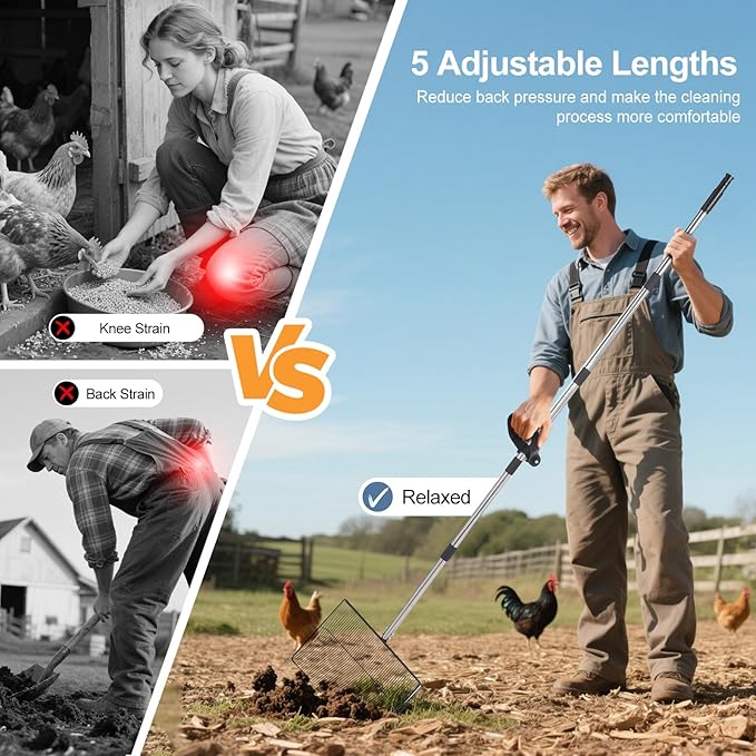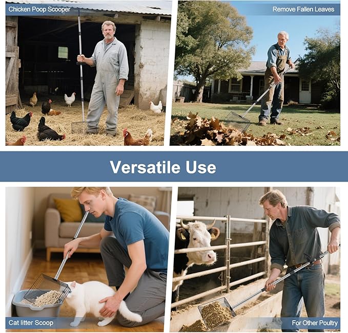 - 【Multi-functional Sifter Shovel】: This sifting shovel is not just limited to chicken coops. It can be used in various different scenarios, such as goat stalls, horse stables or your backyard. You can adjust it to the right length to make it as a leaf cleaning shovel, beach search sand scoop, horse poop scooper and cow pens shovel, etc.